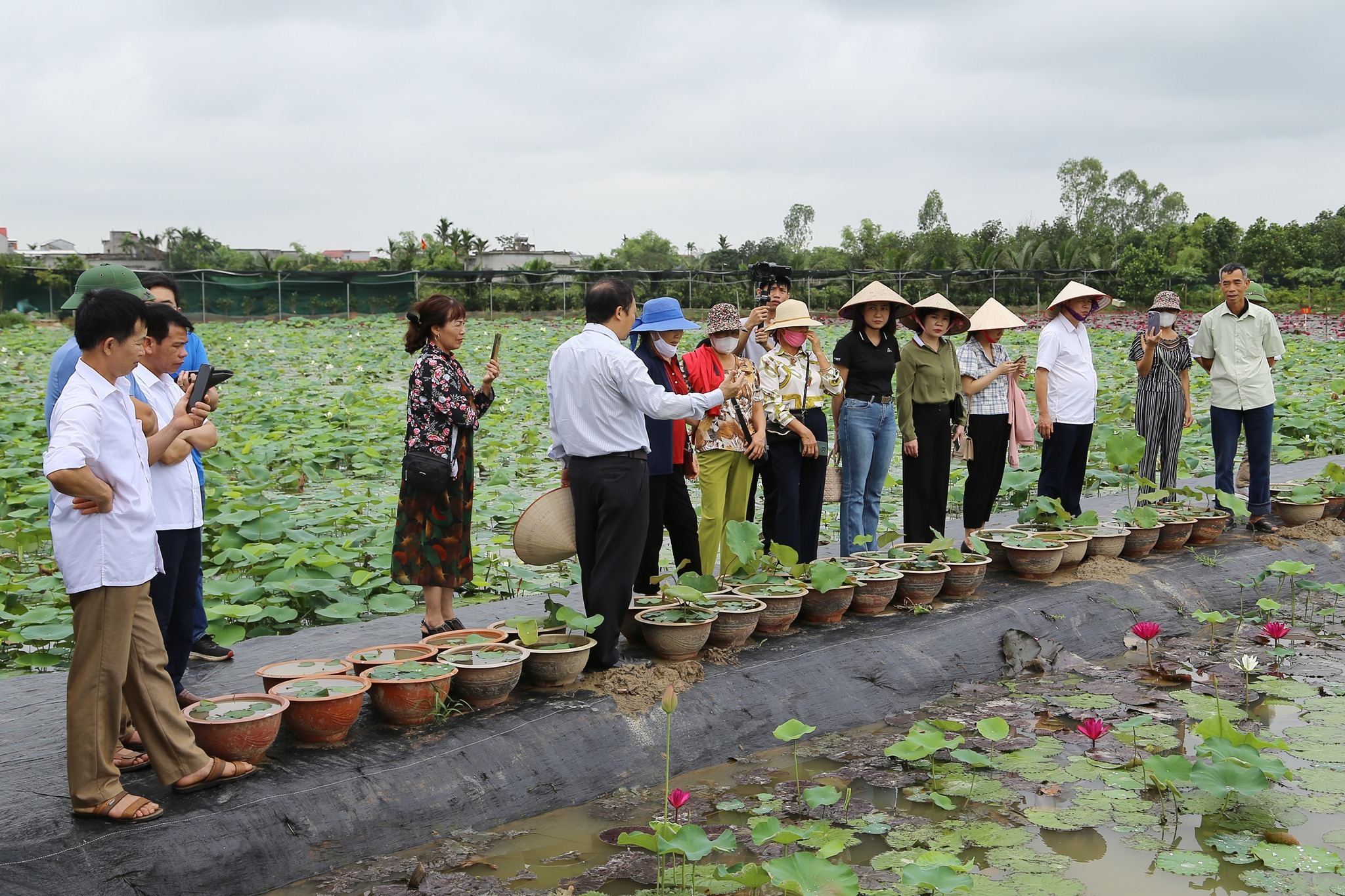 Đón tiếp bà con làng Mon trên cánh đồng sen Vân Đài